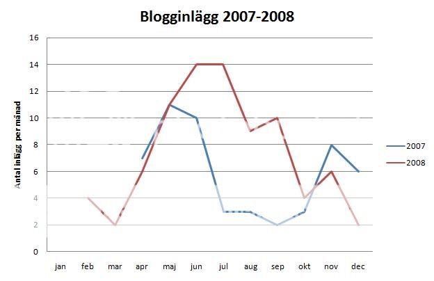Så ser utvecklingen ut. Den går neråt såhär i slutet på året. I genomsnitt har jag skrivit 6,75 inlägg per månad (under de 20 månaderna som bloggen har uppdaterats med nya inlägg). Flest inlägg, 14 st, gjordes i juni 2008, medan det publicerades 0 inlägg i januari samma år. Det som gör det hela ännu mer ointressant är nivån av engagemang för att förbättra statistiken är så hög att jag skriver ett inlägg om fenomenet.